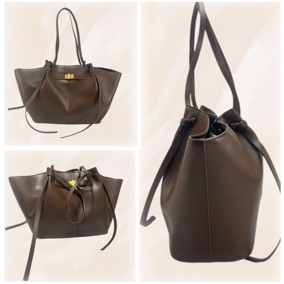 Disponibile in due raffinate varianti — nero intenso e caldo color cuoio — questa borsa unisce linee pulite e dettagli dorati per un look sofisticato che si adatta a ogni occasione.