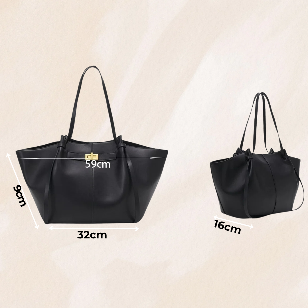 I manici lunghi assicurano un trasporto comodo anche quando è piena, mentre la chiusura dorata aggiunge un tocco di raffinatezza, garantendo sicurezza e ordine.